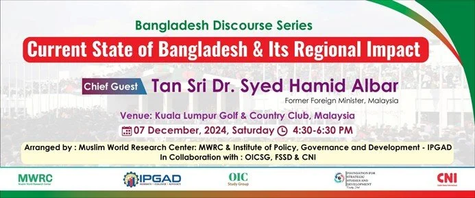 On the “Current State of Bangladesh & its Regional Impact”, Institute of Policy, Governance and Development (IPGAD) hosted in collaboration with MWRC, OIC Study Group, CNI at Kuala Lumpur Golf and Country Club, Malaysia on 7th December 2024. The Chief Guest was Tanseri Syed Hamid Albar, and dignitaries from South Asian and South-East Asia joined the event. The session was moderated by Secretary of MWRC, Dr. Isharof Hossain.
